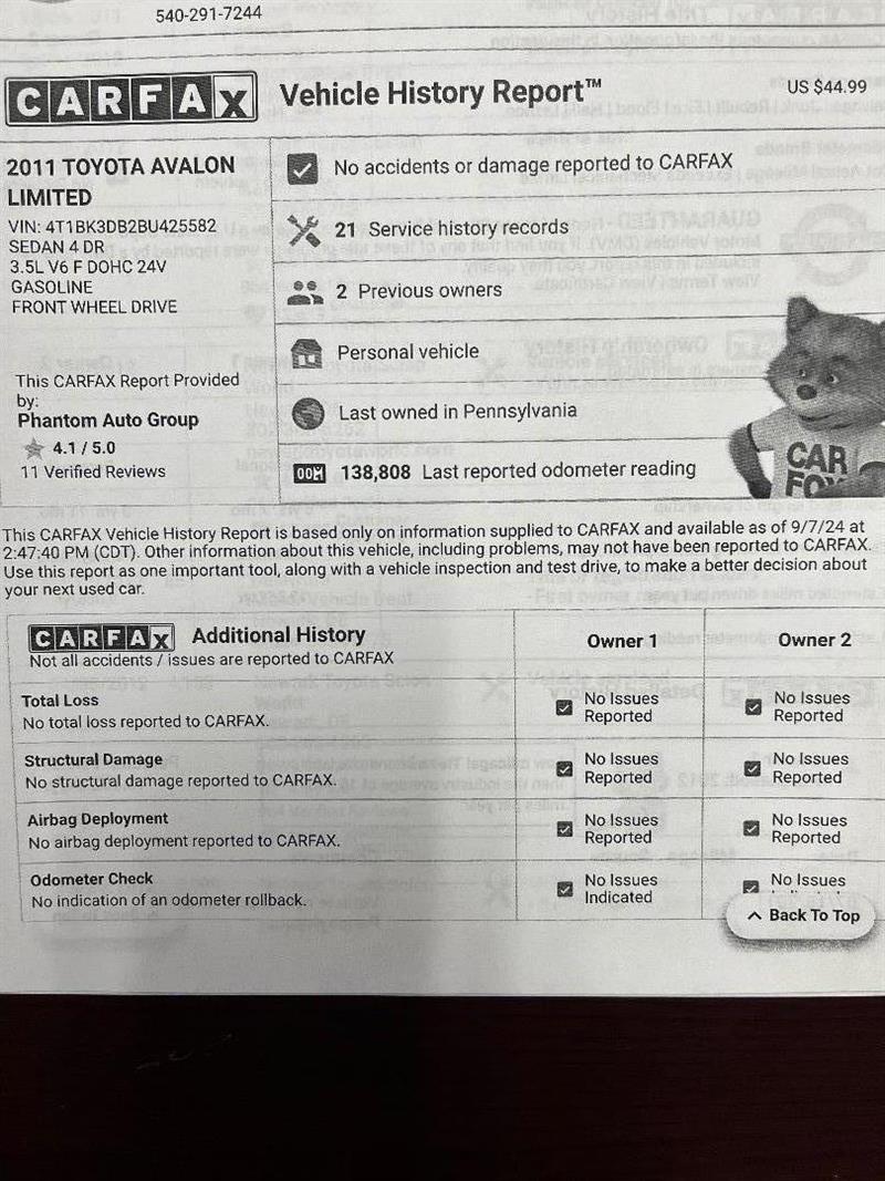 • GUARANTEED FINANCING AVAILABLE**LIMITED EDITION** 2011 TOYOTA AVALON LIMITED, LOADED WITH NAVIGATION, BACK UP CAMERA, SUNROOF, LEATHER HEATED/COOLING SEATS, JBL SOUND SYSTEM, BLUETOOTH STREAMING, XENON HID HEADLIGHTS, PUSH START, DRIVES VERY SMOOTH AND POWERFUL, WELL MAINTAINED, 3.5L DOHC EFI 24-VALVE V6 engine and driven only 138955 miles! CONTACT US TODAY AT 540-891-7000 OR TEXT US AT 571-645-4633 FOR AVAILABILITY AND TO SCHEDULE A TEST DRIVE. FOR MORE INFORMATION, PLEASE VISIT OUR WEBSITE AT WWW.PHANTOMAUTOGROUP1.COM. WE OFFER NATIONWIDE SHIPPING!!